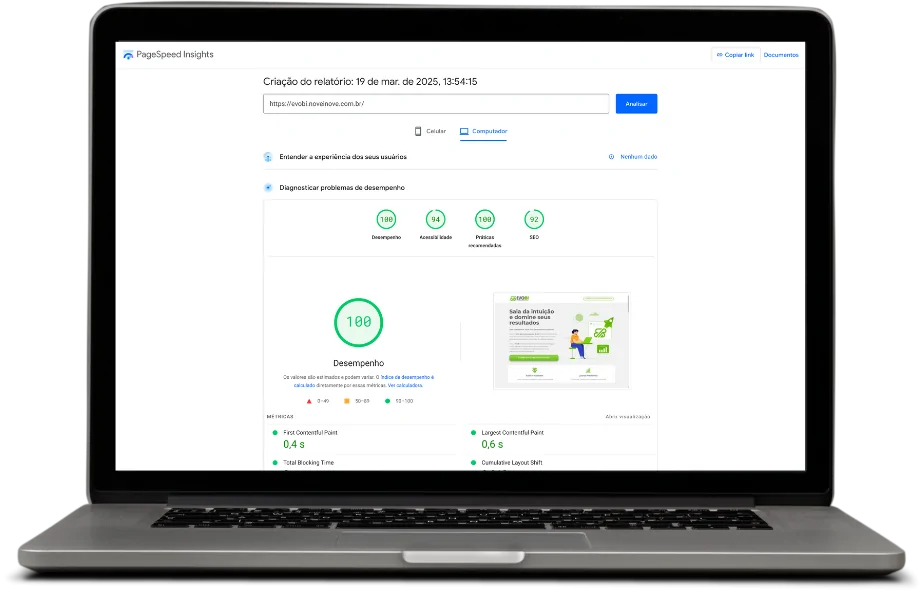 Os sites que eu crio são projetados para entregar velocidade e performance de alto nível. Utilizo as melhores práticas de otimização para garantir que seu site carregue em milésimos de segundos, proporcionando uma experiência fluida para seus visitantes e melhores resultados nos mecanismos de busca.